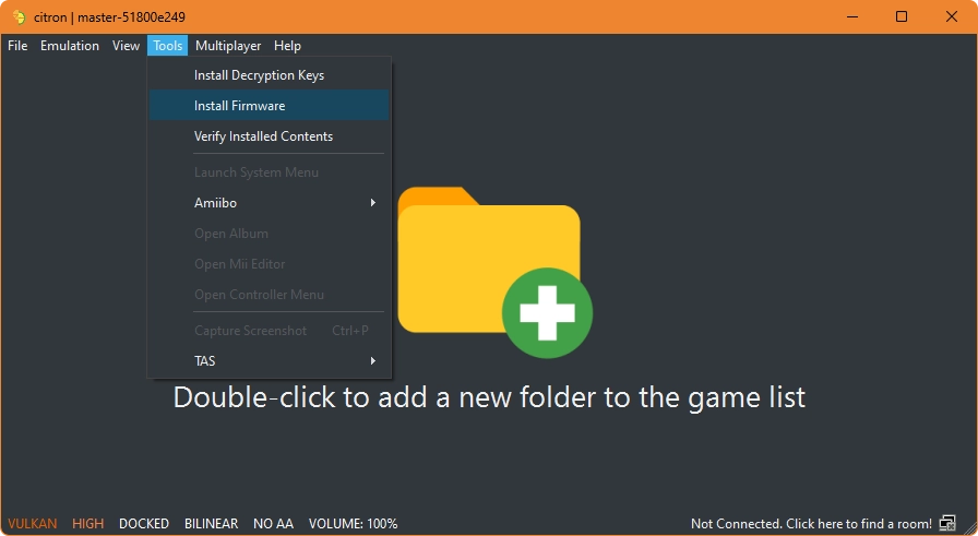 Step 2: Launch the Citron emulator and Click on Tools > Install Firmware.